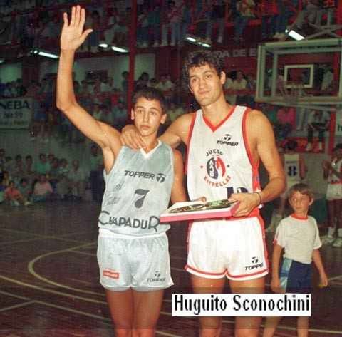 Siguen llegando fotos para El Álbum. Esta es la imagen de un muy joven Hugo Sconochini, que con sólo 17 años se quedó con el torneo de volcadas en el II Juego de las Estrellas que se disputó en Córdoba. El alero vestía la camiseta de Sport Club de Cañada de Gómez y le ganó la final a Luis Villar, con quien comparte la foto. Para mandar fotos, lo pueden hacer a contacto@basquetrosario.com.ar.