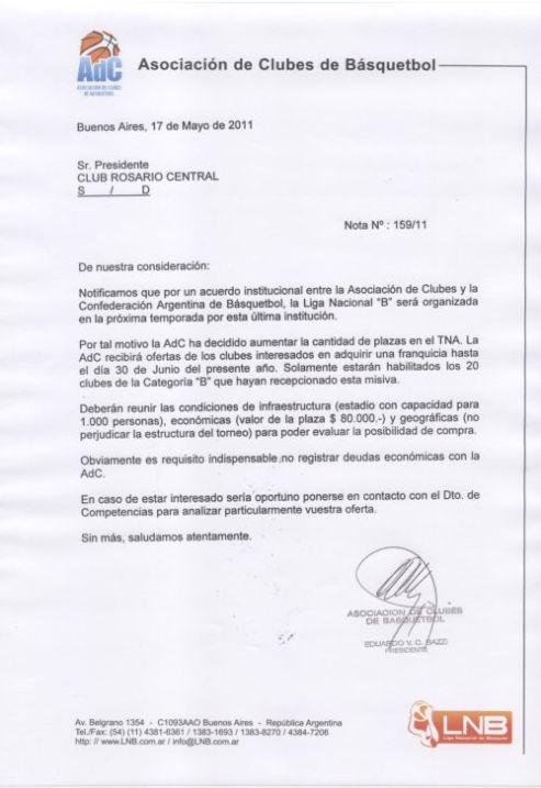 Rosario Central fue invitado oficialmente por la Asociación de Clubes para jugar el TNA. BR te muestra la nota recibida por el canalla. Si bien la dirigencia no confirmó si aceptará, el departamento de básquet esta trabajando para poder armar todo. De todas maneras, la Confederación también mandó el comunicado para que Central forme parte de la nueva Liga B. Mirá la nota.