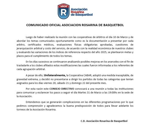 En este sentido, informamos que dejamos sin efecto la medida comunicada oportunamente y manifestamos nuestra total disposición para ser designados en los torneos de la Asociación Rosarina de Básquet.